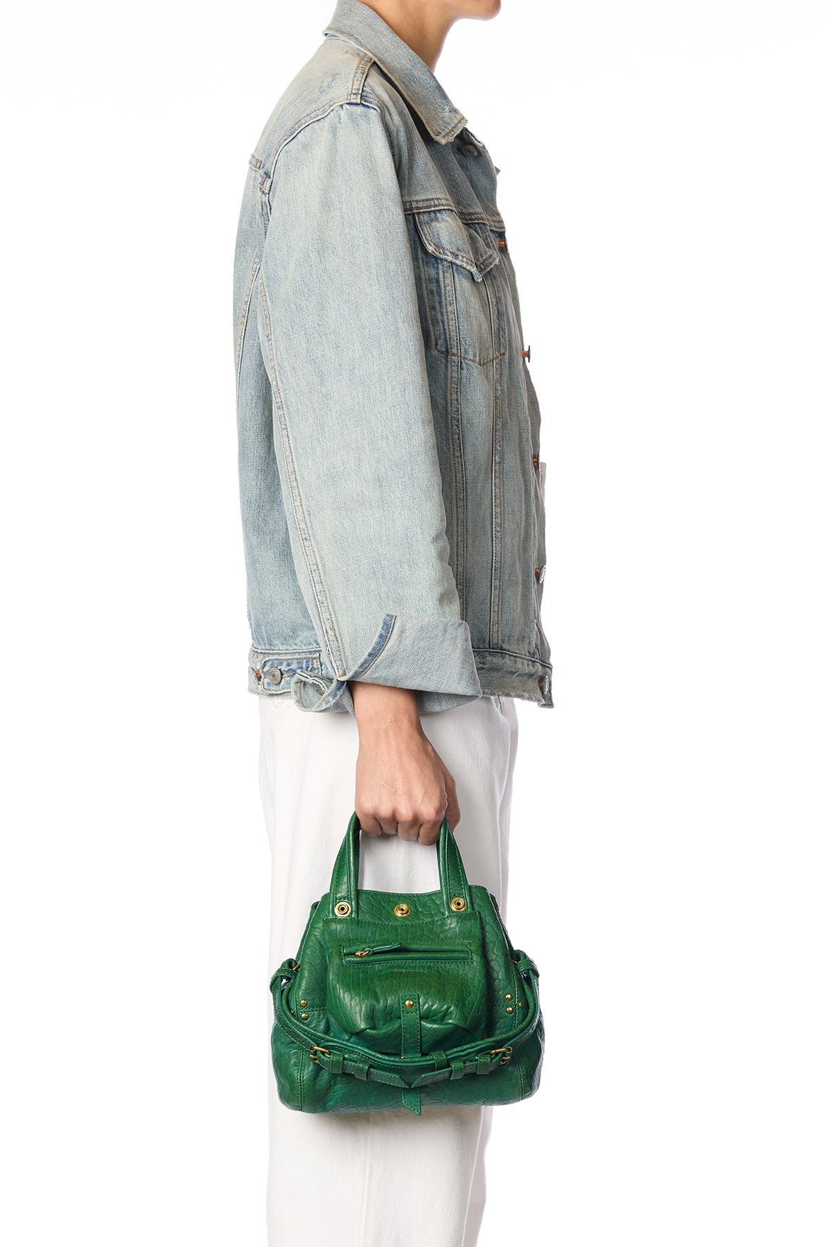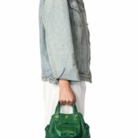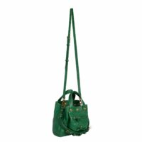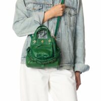 Mini-sac bandoulière, porté à la main. Deux poignées en cuir et une bandoulière en cuir amovible et ajustable. Fermeture par des boutons pressions.