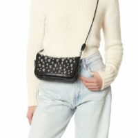 Une bandoulière amovible en chaîne tressée de cuir mesurant 105 cm.