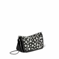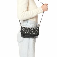 Sac bandoulière, porté à l’épaule ou en croisé. Bandoulière amovible en chaîne tressée de cuir. Fermeture par un rabat en cuir aimanté.