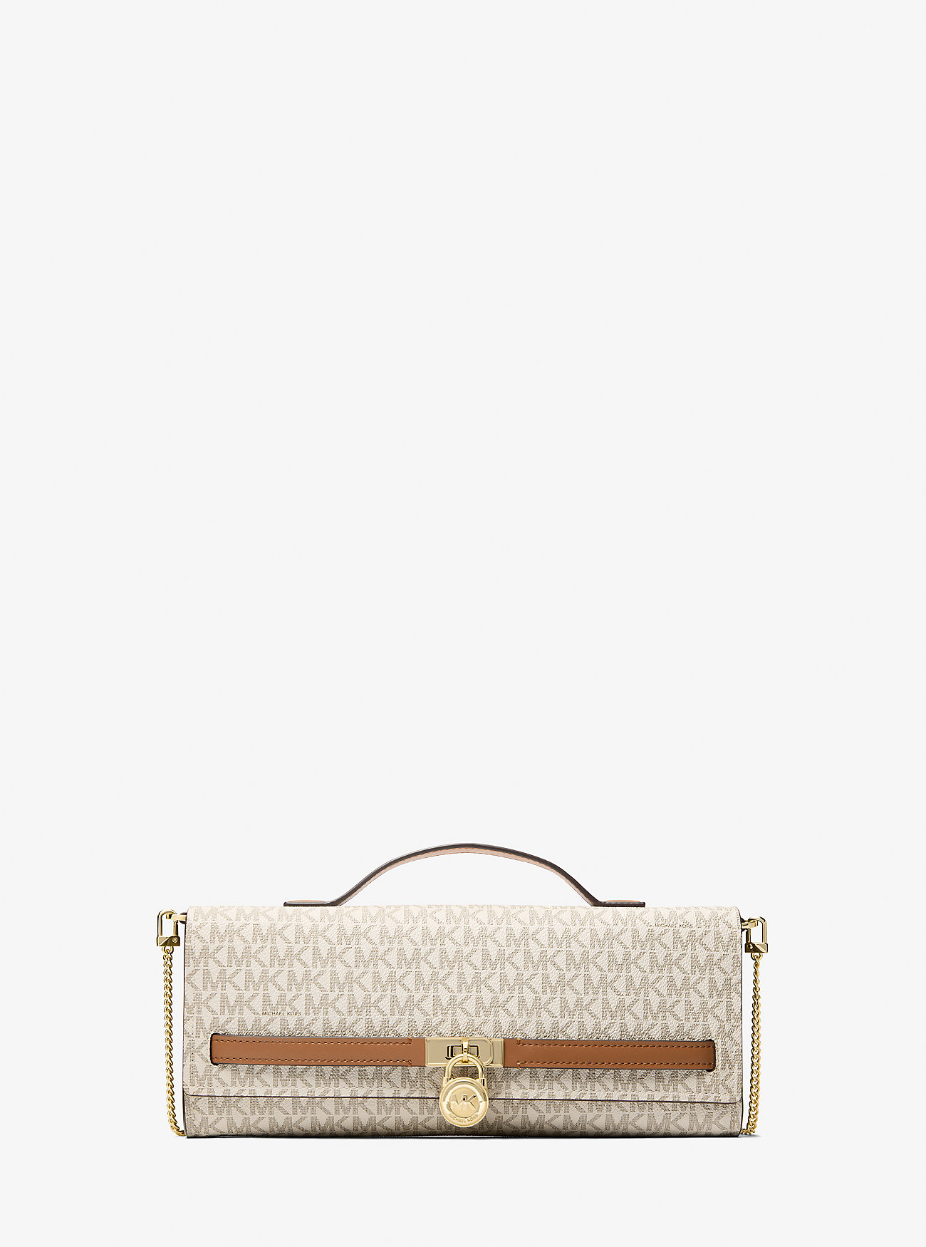 Élégante et d'une féminité classique, cette pochette tendance est la dernière-née de notre collection Hamilton Moderne. Confectionnée en toile à imprimé logo Signature, elle présente une silhouette fine et se distingue par son cadenas doré et sa bandoulière chaîne amovible, pour une touche d'éclat. Un indispensable pour vos soirées.