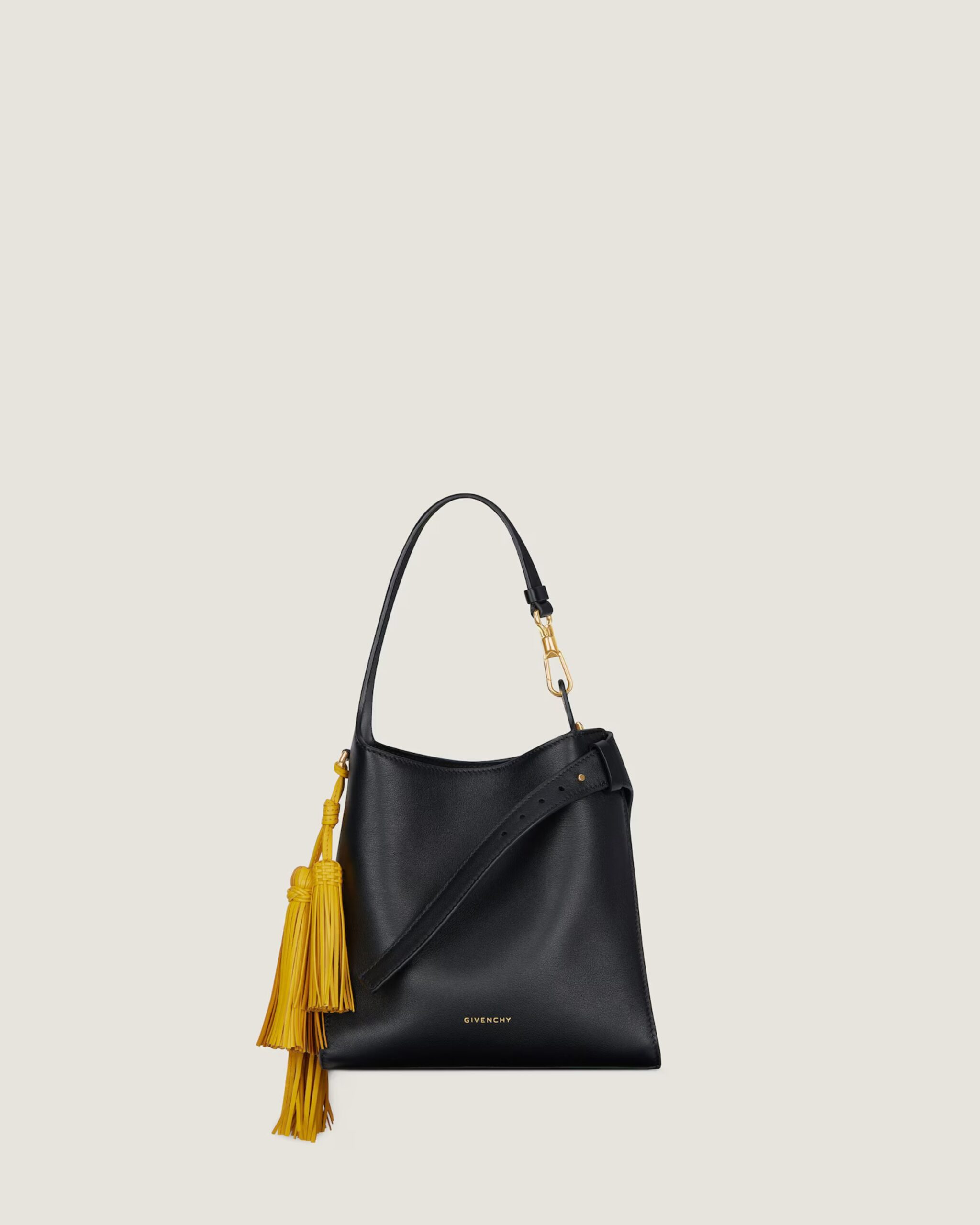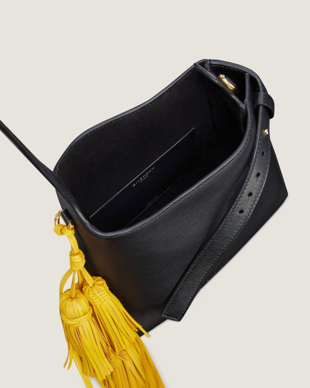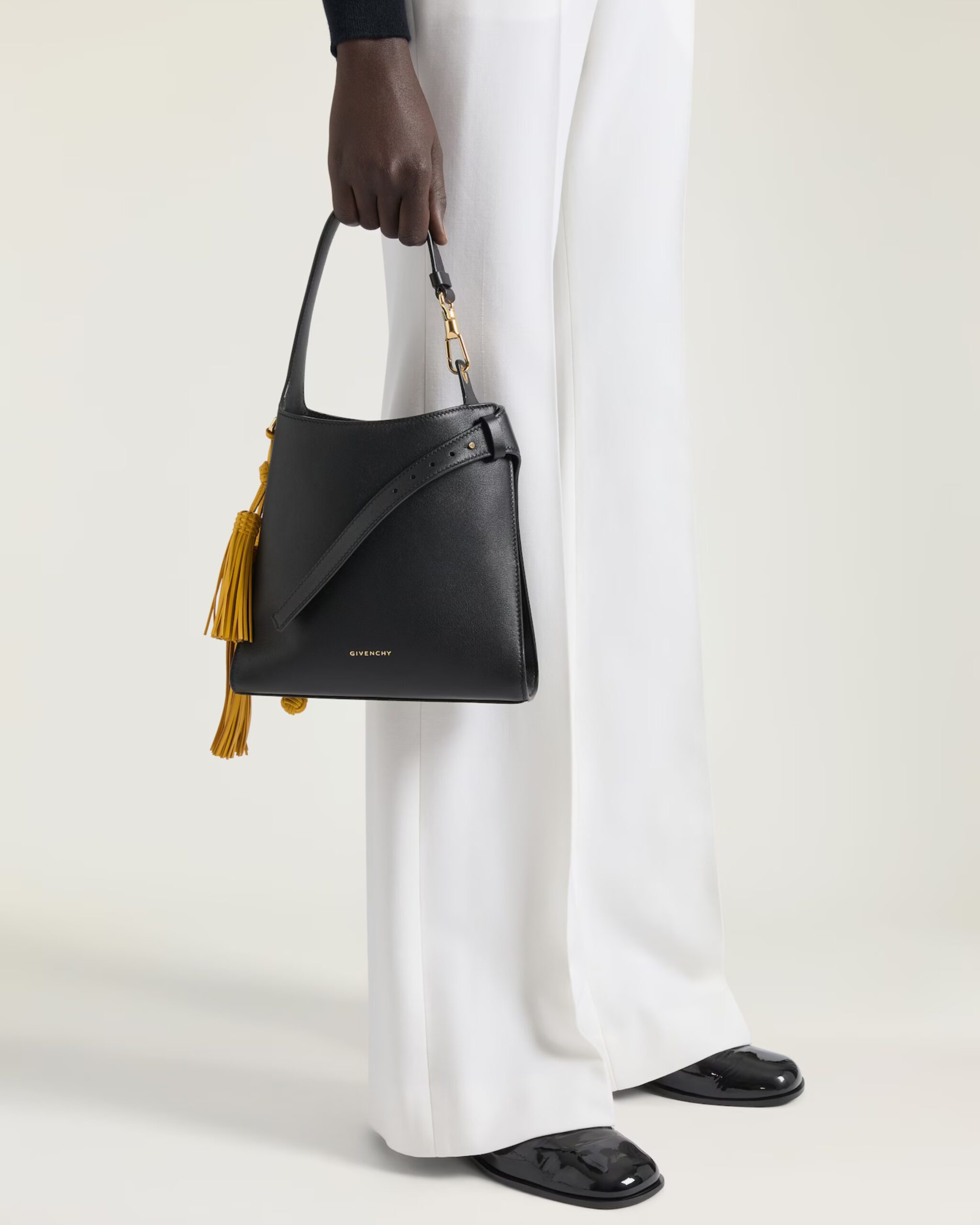 Sophistiqué et compact, le Mini Belted Hobo Bag en cuir mêle style décontracté et élégance haut de gamme. Son design se distingue par une ceinture décorative en cuir à l’avant, un pompom en cuir amovible et des détails métalliques finition dorée, pour une touche raffinée. Le sac affiche la signature GIVENCHY embossée sur la face avant, marquant son appartenance à l’univers du luxe.