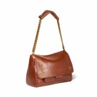 •Une bandoulière chaîne et cuir amovible et ajustable en deux longueurs; mesurant au maximum 105 cm et dimension au plus court 52,5 cm; avec large patte épaule en cuir pressionnée.