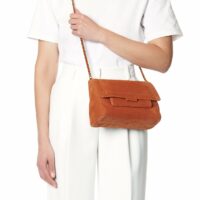 Sac besace, porté épaule ou croisé. Bandoulière chaîne et cuir, amovible et ajustable. Rabat avec fermeture aimantée.