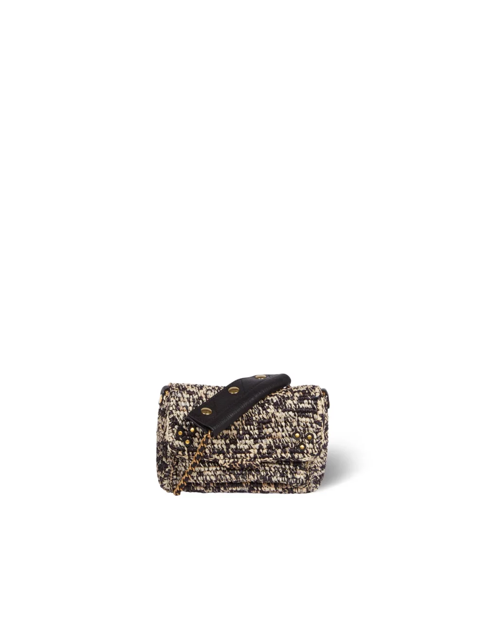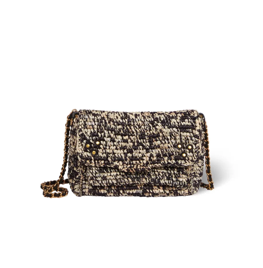 Sac bandoulière en raphia beige et noir.
