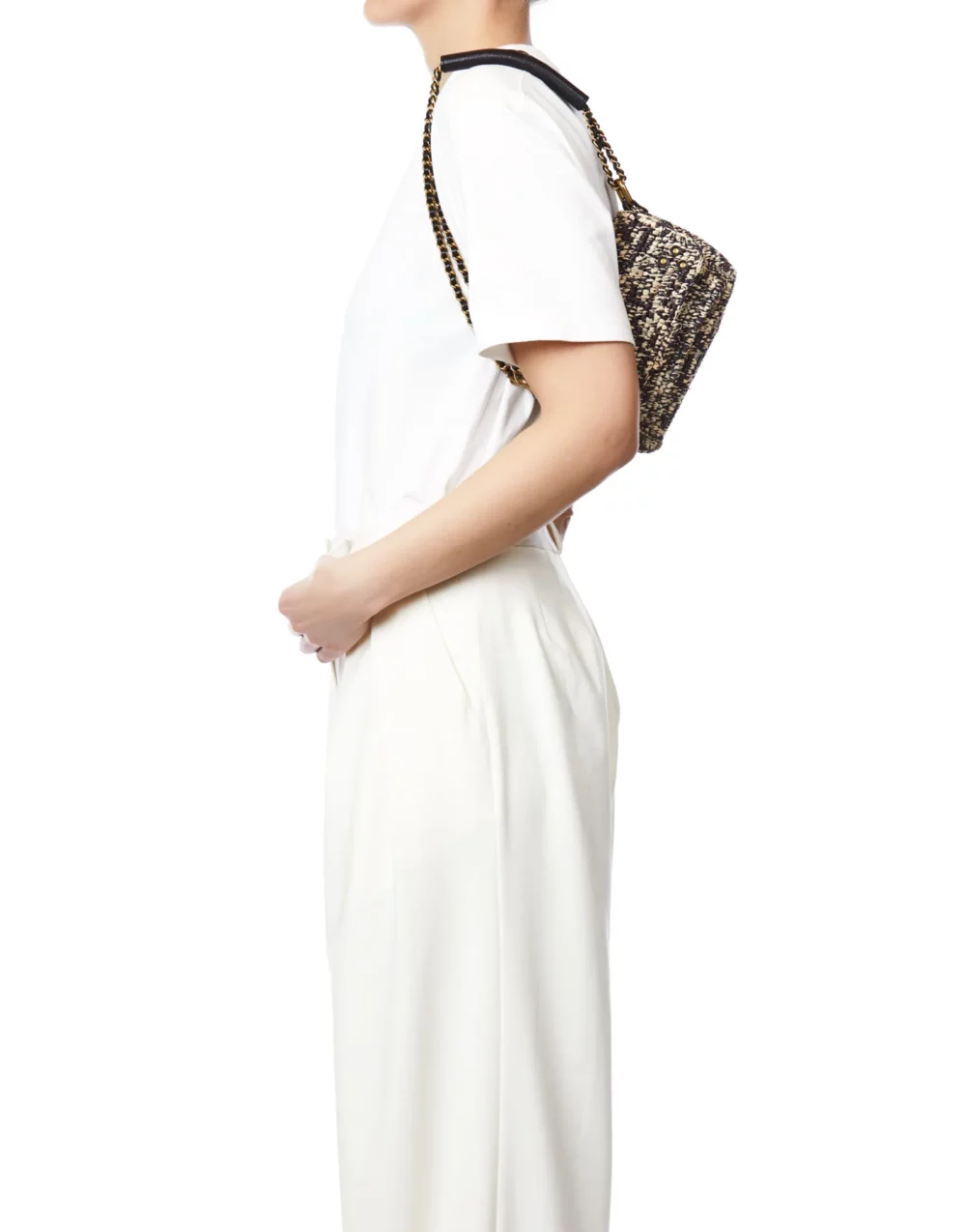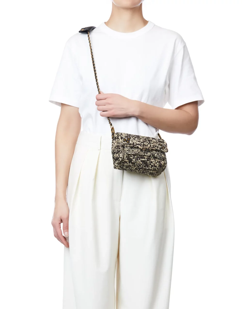 Bandoulière tressée en cuir et chaîne amovible par mousquetons et réglable en deux longueurs.