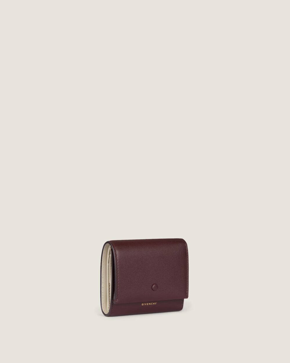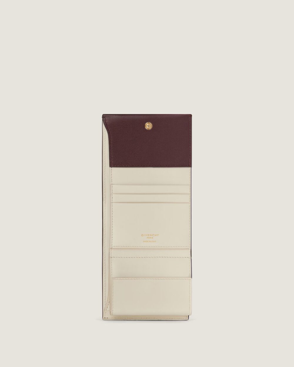 Compact et élégant, le Day Wallet en cuir brillant marie le raffinement Givenchy à un style pratique pour le quotidien. Confectionné en cuir de veau lisse à effet brillant, avec une doublure en agneau douce, ce porte-monnaie offre une finition luxueuse. Le rabat se ferme à l’aide d’un bouton-pression recouvert de cuir, garantissant sécurité et fluidité.