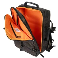 • L'intérieur est divisé en deux compartiments : l'un plus compact avec un organisateur, l'autre spacieux avec des poches rembourrées pour ordinateur et tablette.