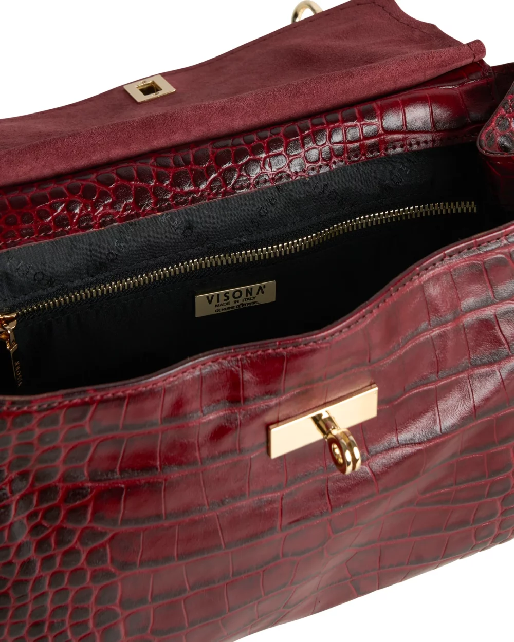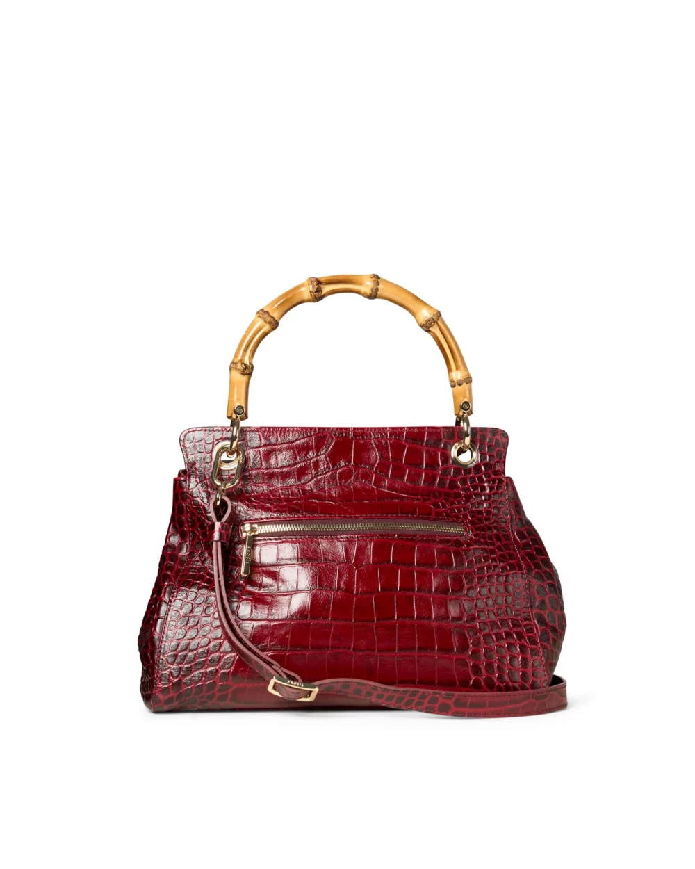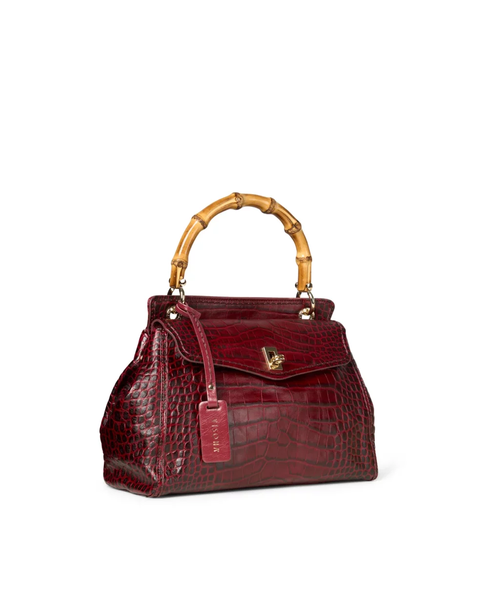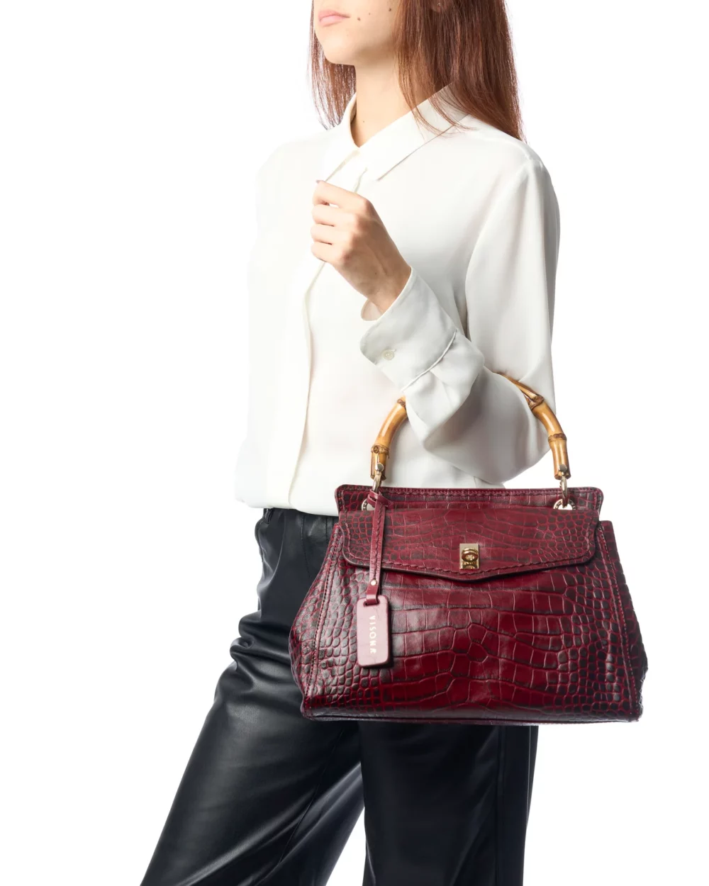 Découvrez la ligne Miami. Ce sac peut se porter à la main ou à l’épaule grâce à sa bandoulière amovible. Les coutures distinctives et les détails en bambou ajoutent une touche d’élégance raffinée. 100 % Made in Italy.