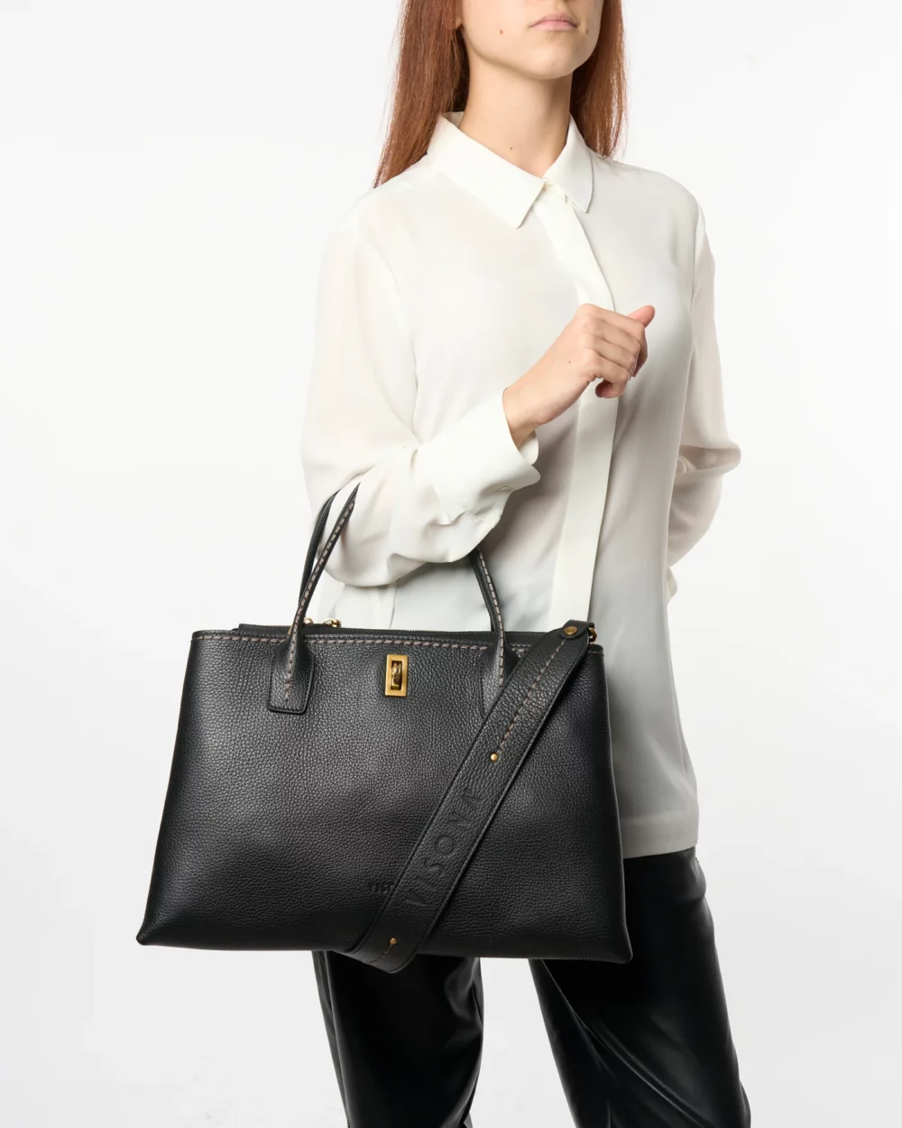 Découvrez la ligne Penelope. Ce sac se porte à la main ou à l'épaule. Son fermoir à clip lui confère une touche d'élégance et des lignes épurées. 100 % fabriqué en Italie.